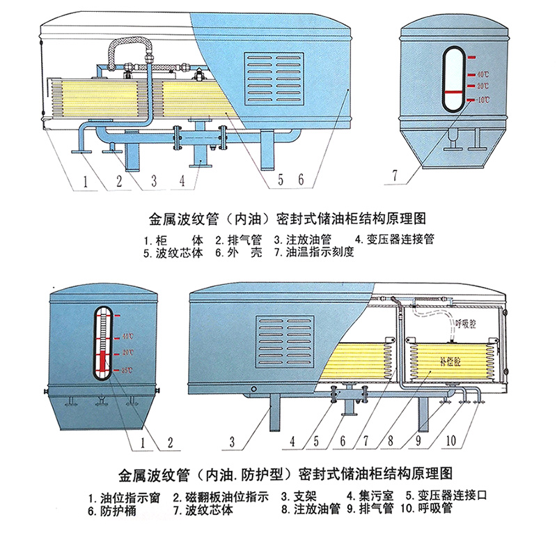 1、內(nèi)油及內(nèi)油(防護(hù)型)儲油柜,芯體采用傳統(tǒng)波紋管芯體,具有受力均勻、不易失穩(wěn)、能承受較大壓力、立式運行平穩(wěn)可靠的優(yōu)點。內(nèi)部作為補償腔,是波紋管作為補償元件的最理想、合理的選擇。符合波紋管的運行規(guī)律,能使儲油柜始終保持微正壓運行。