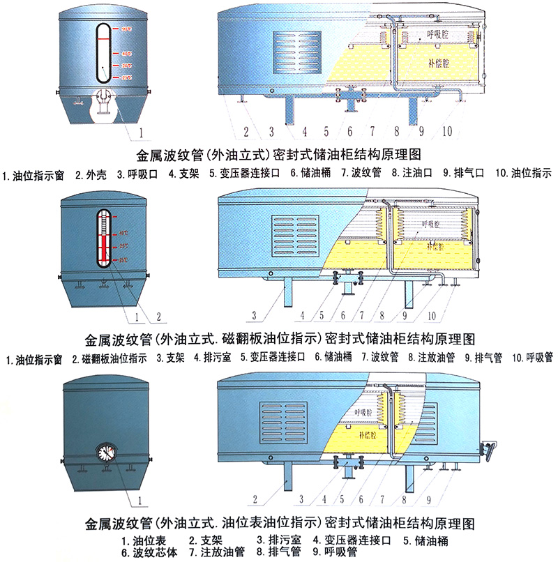 金屬波紋管(外油立式)密封式儲油柜,是我公司根據(jù)多年來用戶使用波紋儲油柜的意見和建議,研制生產(chǎn)的新一代儲油柜。它使用的是圓柱形波紋管芯體,實現(xiàn)變壓器油隨溫度變化的容積補償和油質(zhì)保護。圓柱形波紋管,受力均勻,承壓能力強,不易失穩(wěn)變形。加工工藝簡單,更容易保證產(chǎn)品質(zhì)量。該產(chǎn)品克服了外油臥式儲油柜運行時因受變壓器油重力影響受力不均,失穩(wěn)變形、出現(xiàn)卡滯、增大運行壓力等現(xiàn)象。和內(nèi)油式儲油柜比較,波紋芯體受儲油桶保護,運行更安全可靠。該產(chǎn)品油位指示采用窗式指示、磁翻板油位指示、傳統(tǒng)油位表油位指示。指示刻度直接標(biāo)出,準(zhǔn)確、直觀、便于觀察,同時改變了多年來用“油位-油溫曲線板”的習(xí)慣。各種油位指示均設(shè)有高低油位報警裝置,可根據(jù)用戶需要輸出4~ 20mA模擬信號。金屬波紋管外油立式儲油柜性能指標(biāo)先進,技術(shù)成熟可靠,造型美觀大方,是儲油柜的換代產(chǎn)品。